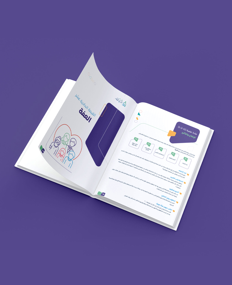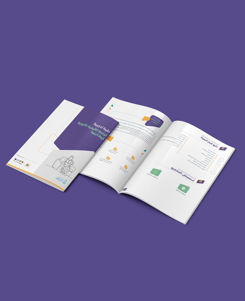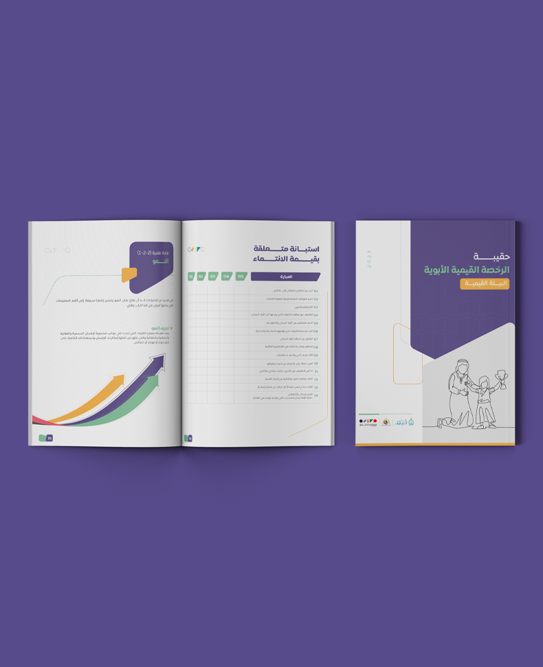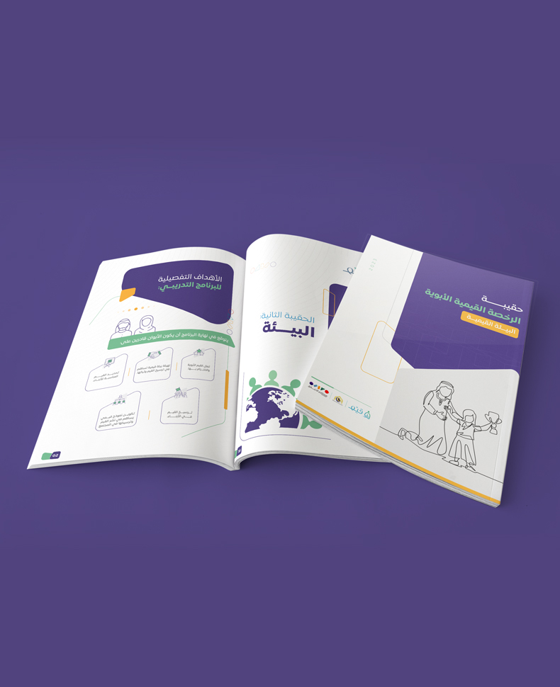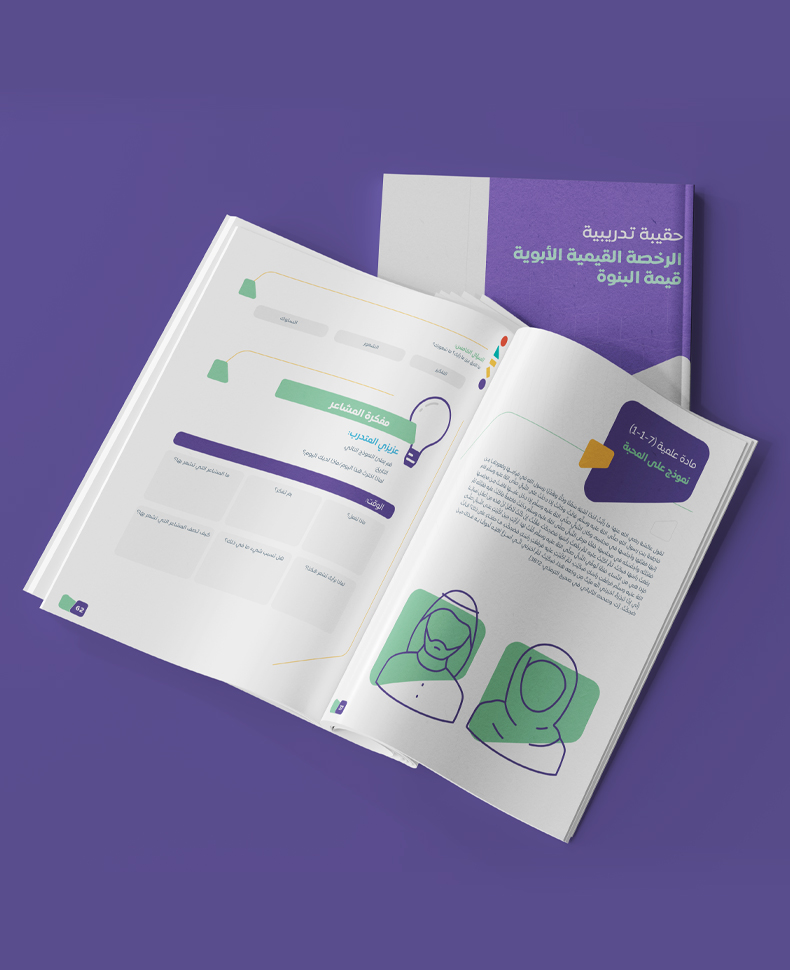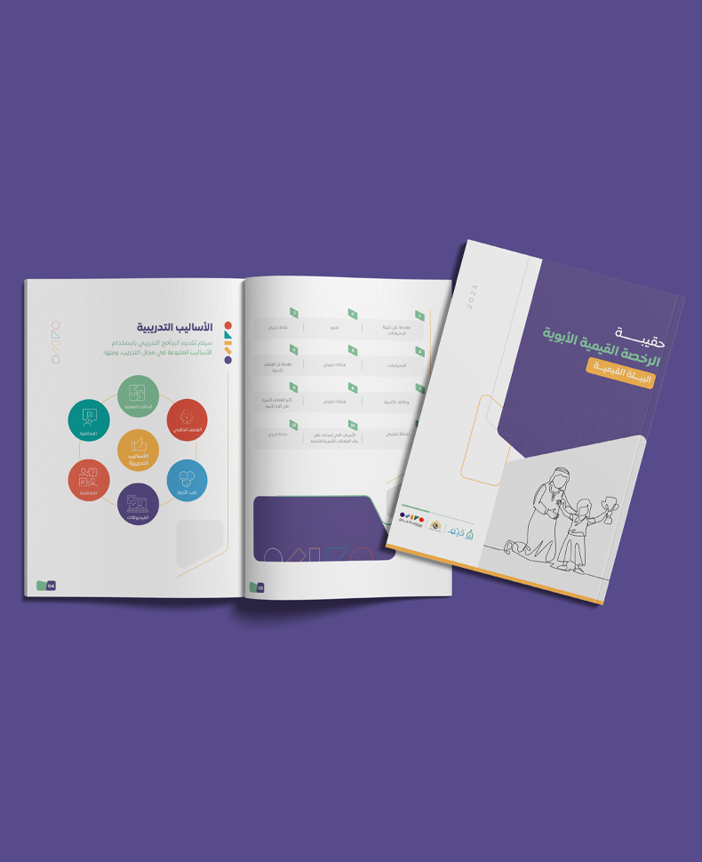 بناء حقيبة تدريبية لأحد برامج جمعية مكارم الأخلاق، حقيبة متكاملة عن القيم الأبوية بتصميم مناسب لهوية البرنامج وبنمط تصميم يحاكي الهوية السعودية، صممت الحقيبة بأسلوب مبتكر وبألوان جاذبة.