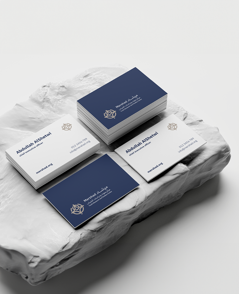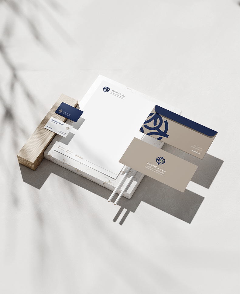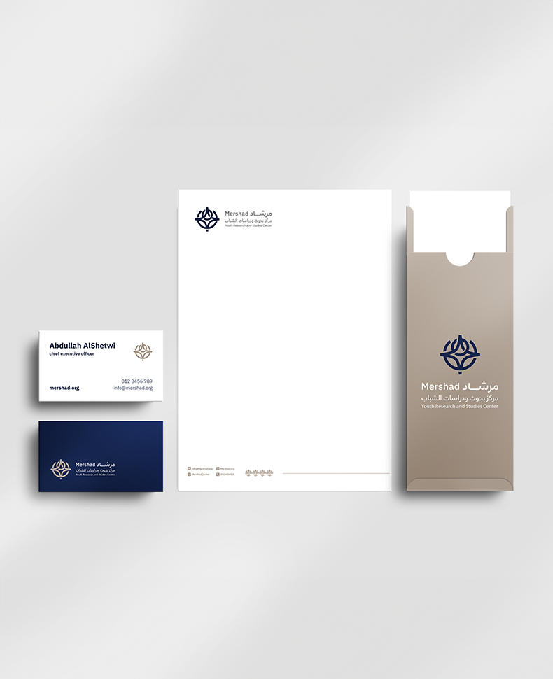 بناء الهوية البصرية لمركز مرشادصمم الشعار بشكل أيقوني مدمج فيه شكلين مميزين.يرمز الشعار الأول إلى نجم سهيل الذي يتميز بقدرته على تحديد الاتجاهات، مما يعكس دور المركز في الاسترشاد والاستكشاف. كما يشير الشكل الآخر من الشعار إلى الاسطرلاب الذي يعتبر من أحد الأدوات التي تستخدم في تحديد الاتجاهات، وذلك يعكس دور المركز في استخدام المعرفة واستثمارها وتوظيف أدوات الابتكار لاستشكاف معارف جديدة تخص الشباب.
