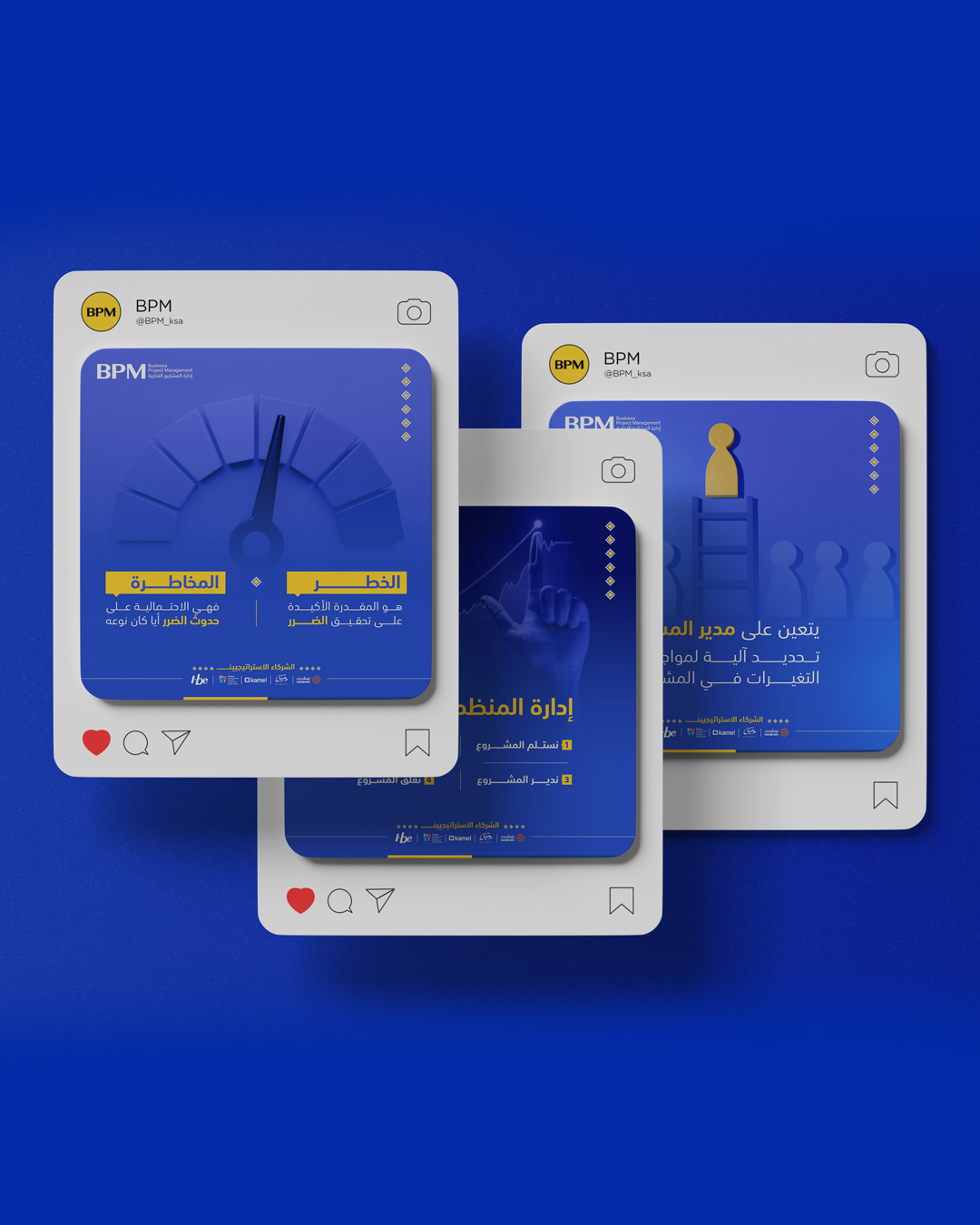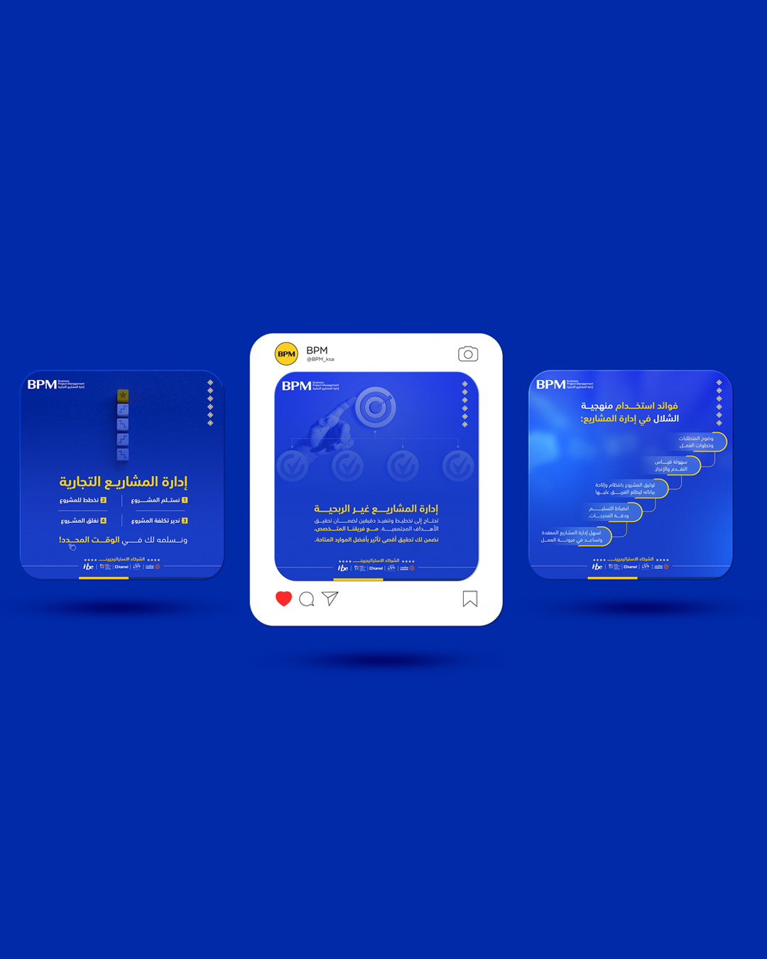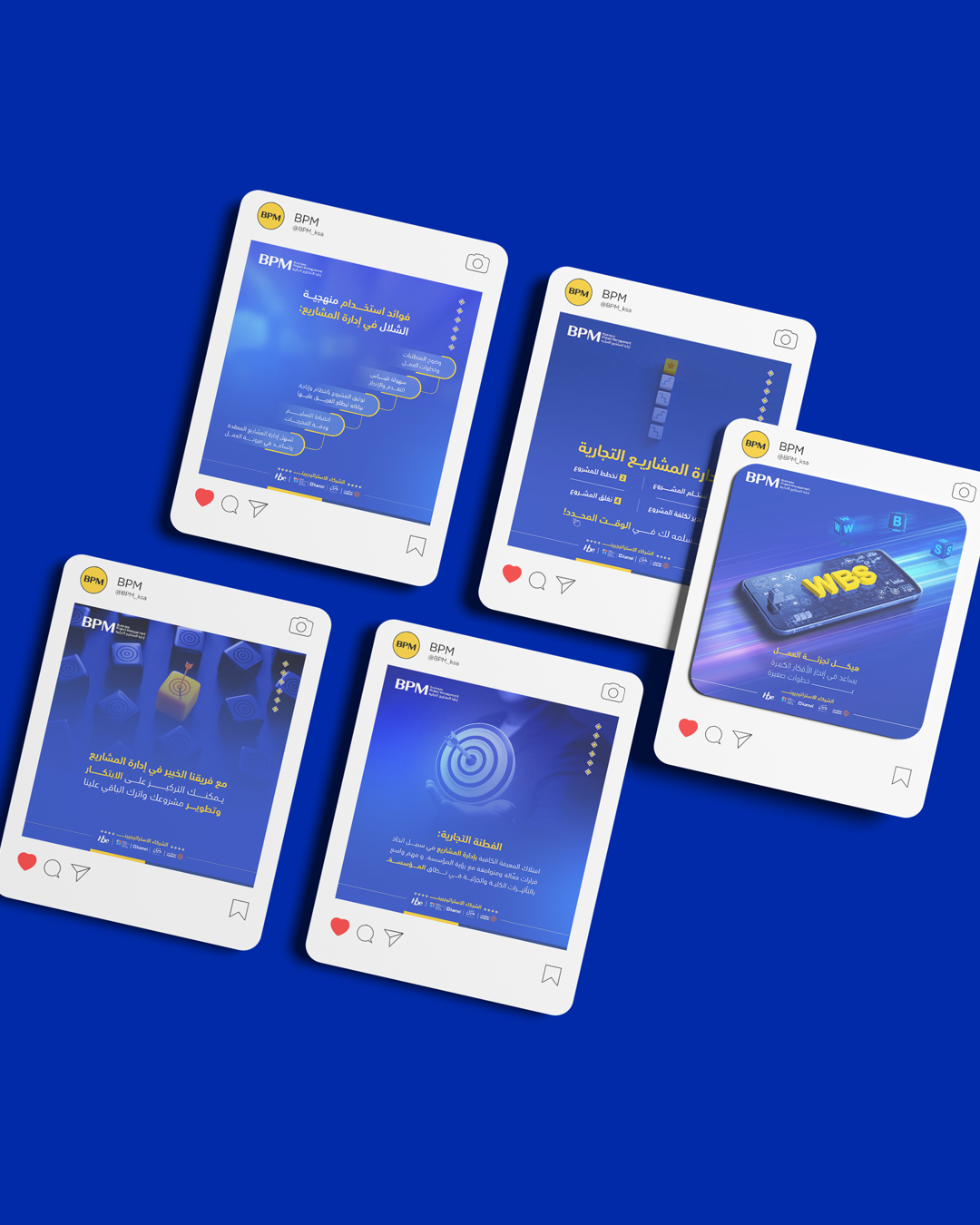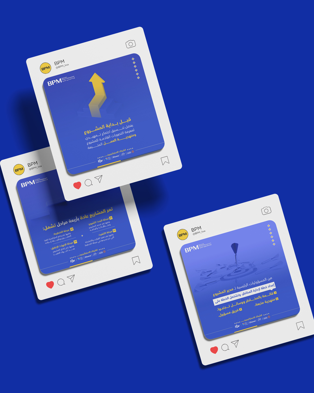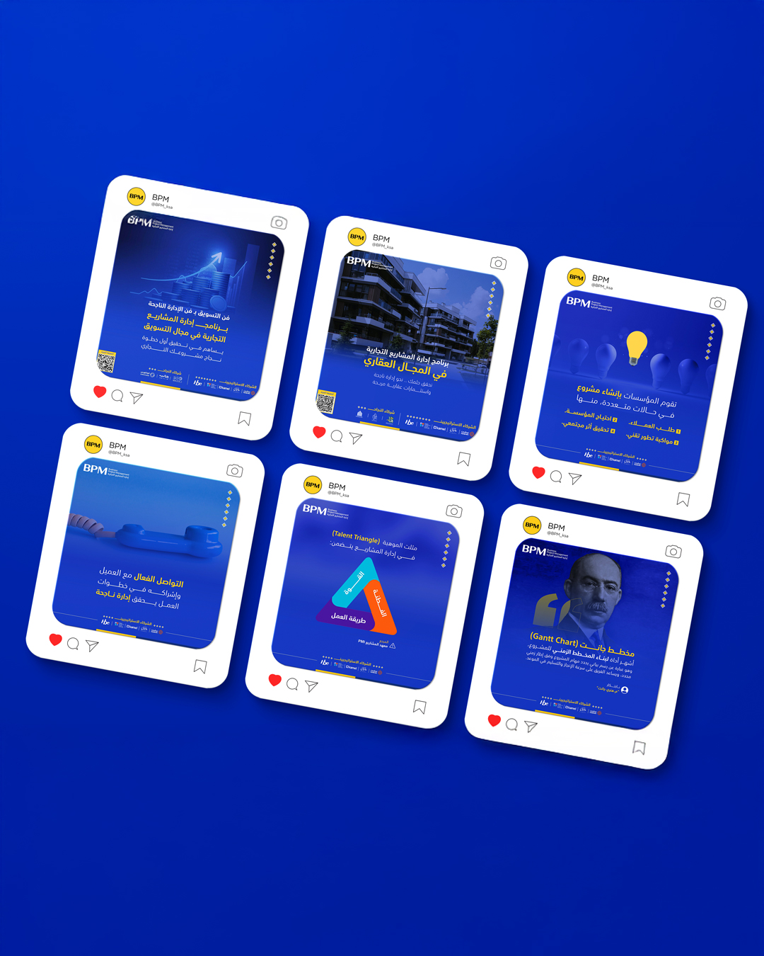 مجموعة من تصاميم السوشال ميديا لمنظمة إدارة المشاريع التجارية، بمحتوى علمي أصيل وبتصاميم مبتكرة وبأسلوب مناسب للفئة المستهدفة ويحقق مستهدفاتها التسويقية.