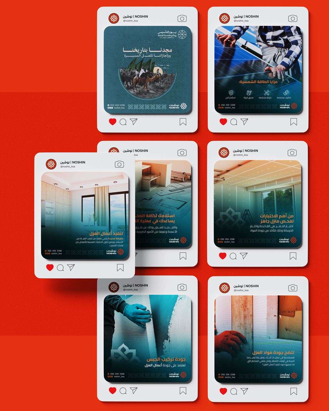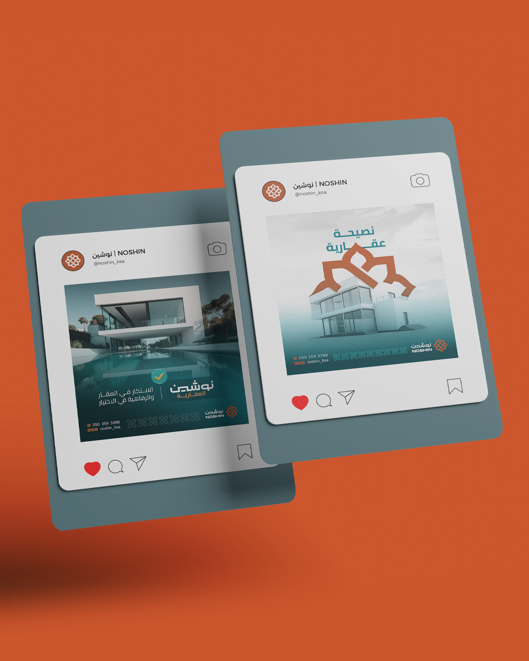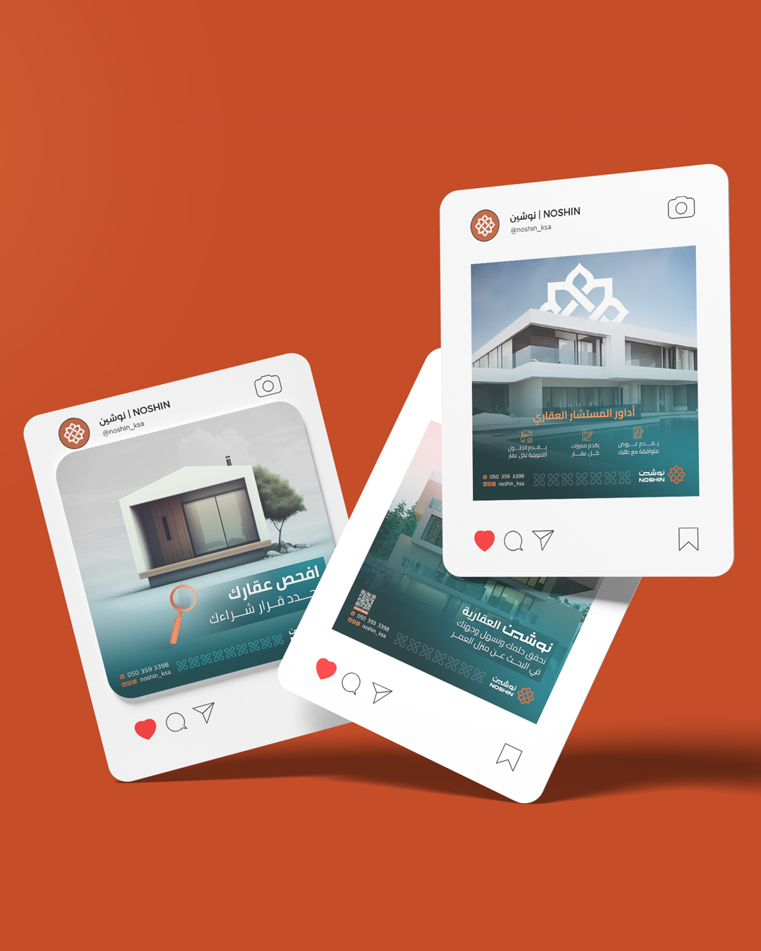 مجموعة من تصاميم السوشال ميديا لحساب نوشين العقاري، بتصاميم إبداعية تعكس الجانب العقاري وبمحتوى يخدم الفئة المستهدفة الباحثة عن عقارات مما يعكس مستهدفات الحساب في رفع مستوى الوعي عن العقارات ،ولتكون أحد محركات البحث في مجال التطوير العقاري.