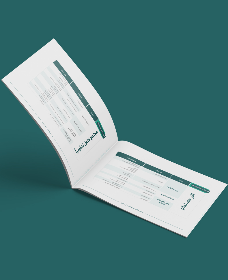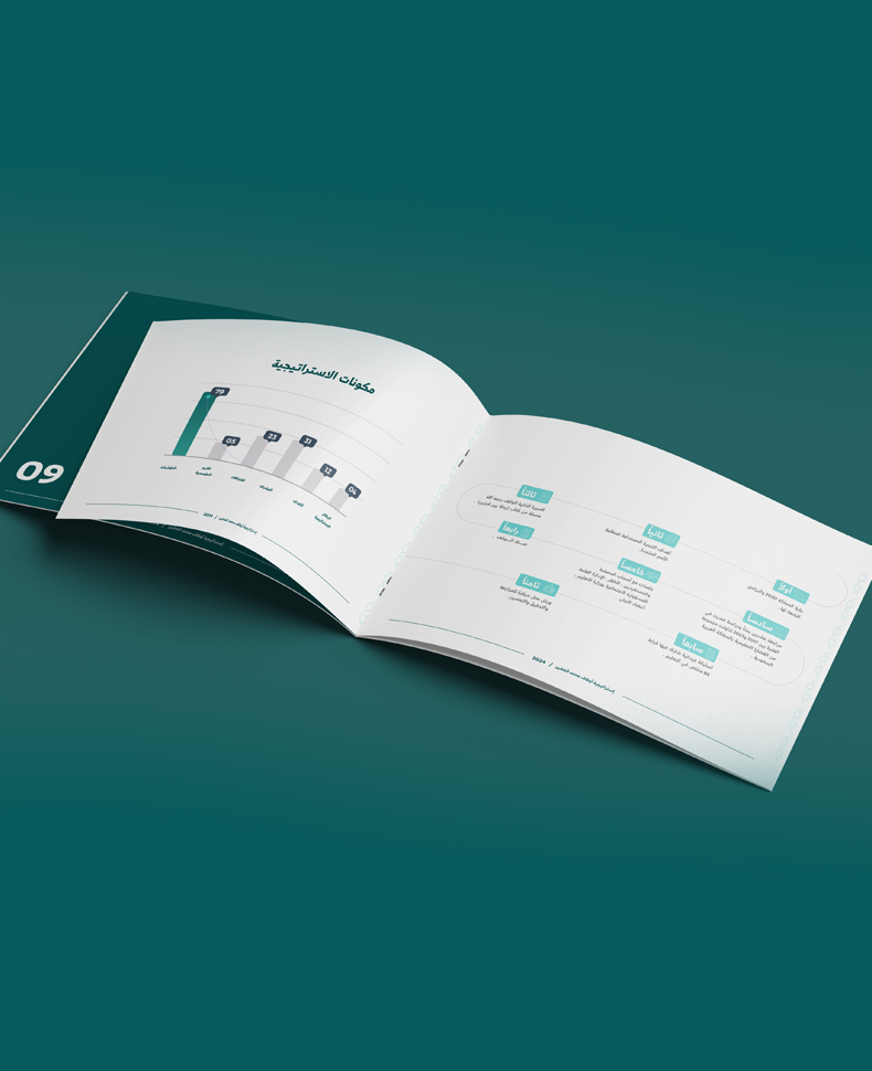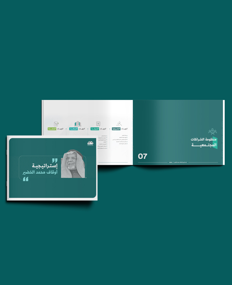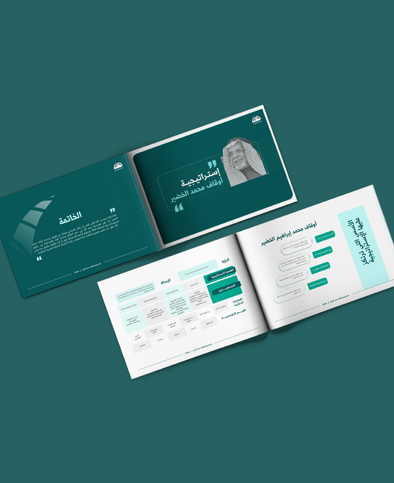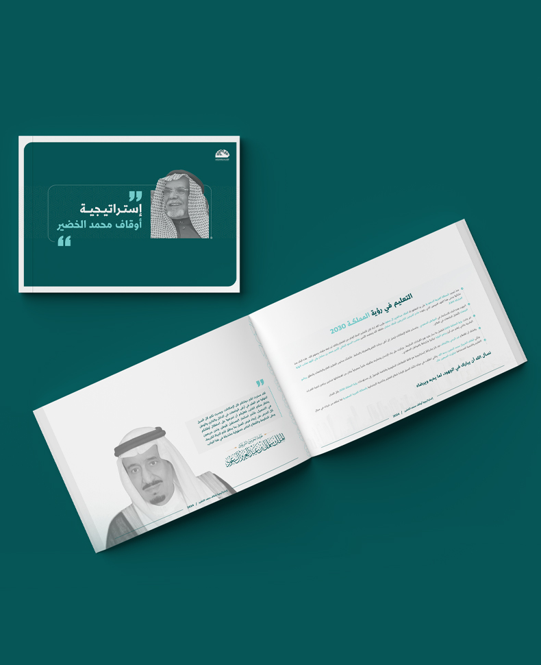 تصميم ملف استراتيجي لأوقاف الخضير بطابع رسمي وبألوان ملفتة للقارئ، صمم هذا الملف ليعرض الاستراتيجية العامة للأوقاف بطريقة واضحة وسلسة، مدعومة بالتصاميم الأيقونية التي تسهل فهم الرؤية والأهداف.